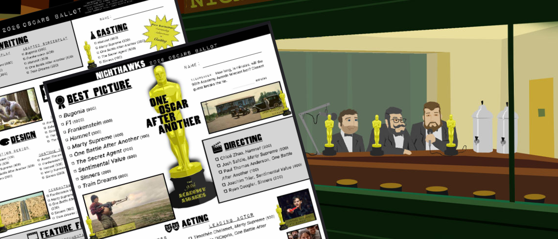 Need a ballot for your Oscar party? Need a ballot for a quiet night alone sobbing into a pillow? We have you covered like cheese on hashbrowns! Oscar Czar and Executive Producer of the Nighthawks 2026 Oscar coverage, Cameron Maris, has put together another wonderful Nighthawks themed UNOFFICIAL Academy Awards Ballot for the 98th annual […]
